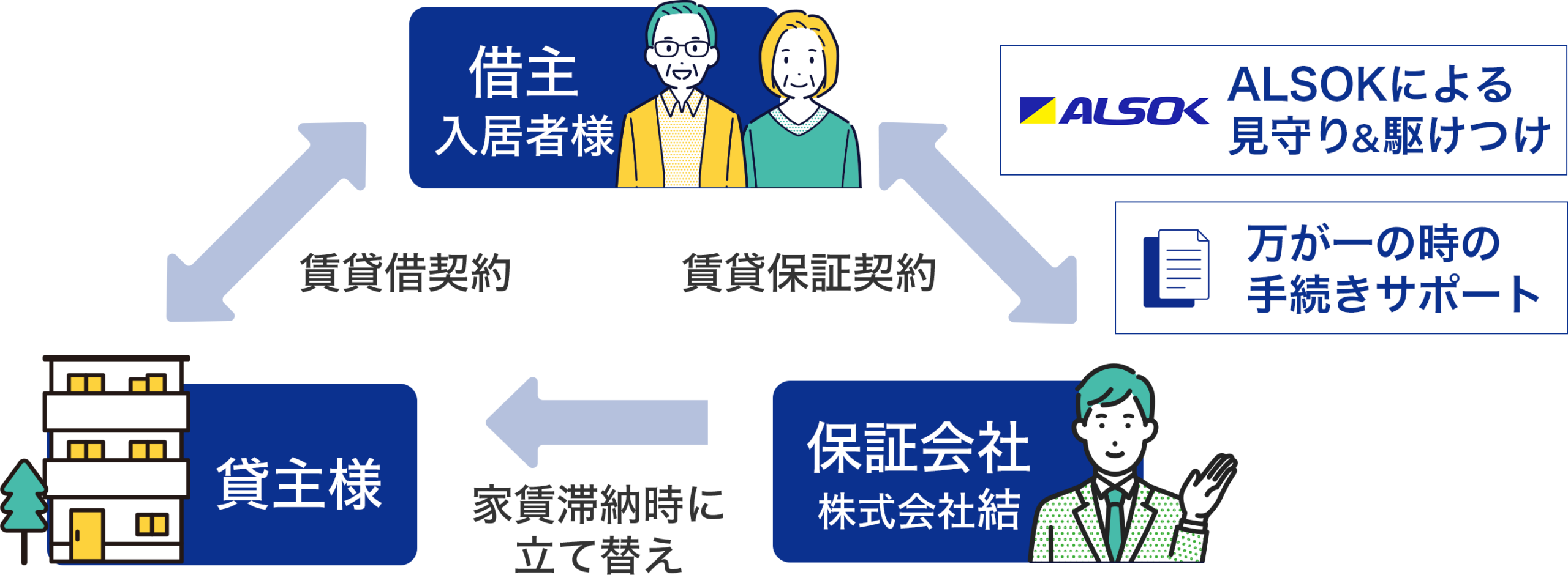 この制度を利用することで、ご親族や知人に連帯保証人をお願いするという心理的な気兼ねや依頼の手間を一切かけることなく、お客様ご自身の責任においてスムーズかつ迅速に賃貸契約を結ぶことが可能となります。